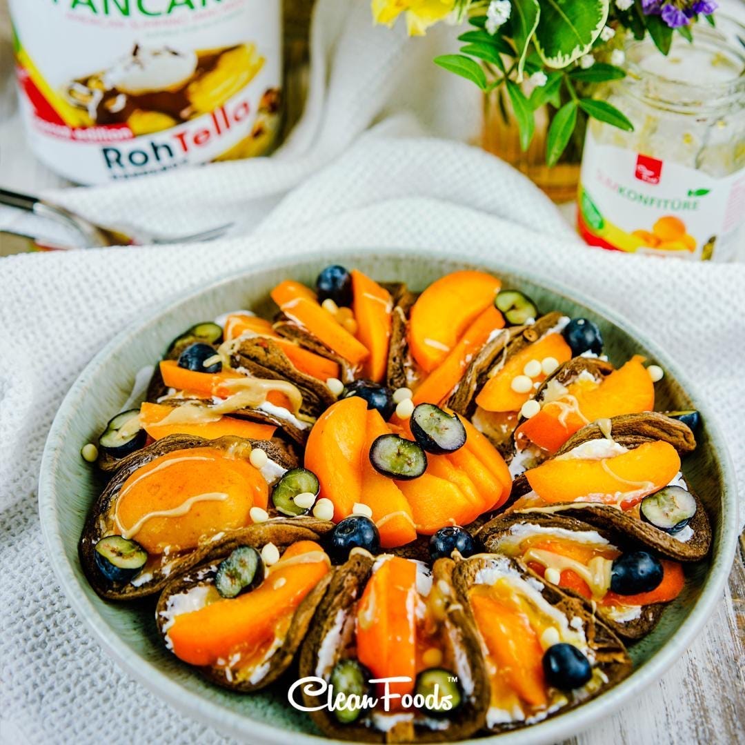 Raw pancakesTryraw pancakes with fruit, e.g. fresh strawberries. Can also be combined with a topping of cleanfoods, such as white or brown chocolate sauce. These are free from sugar, fat and gluten.