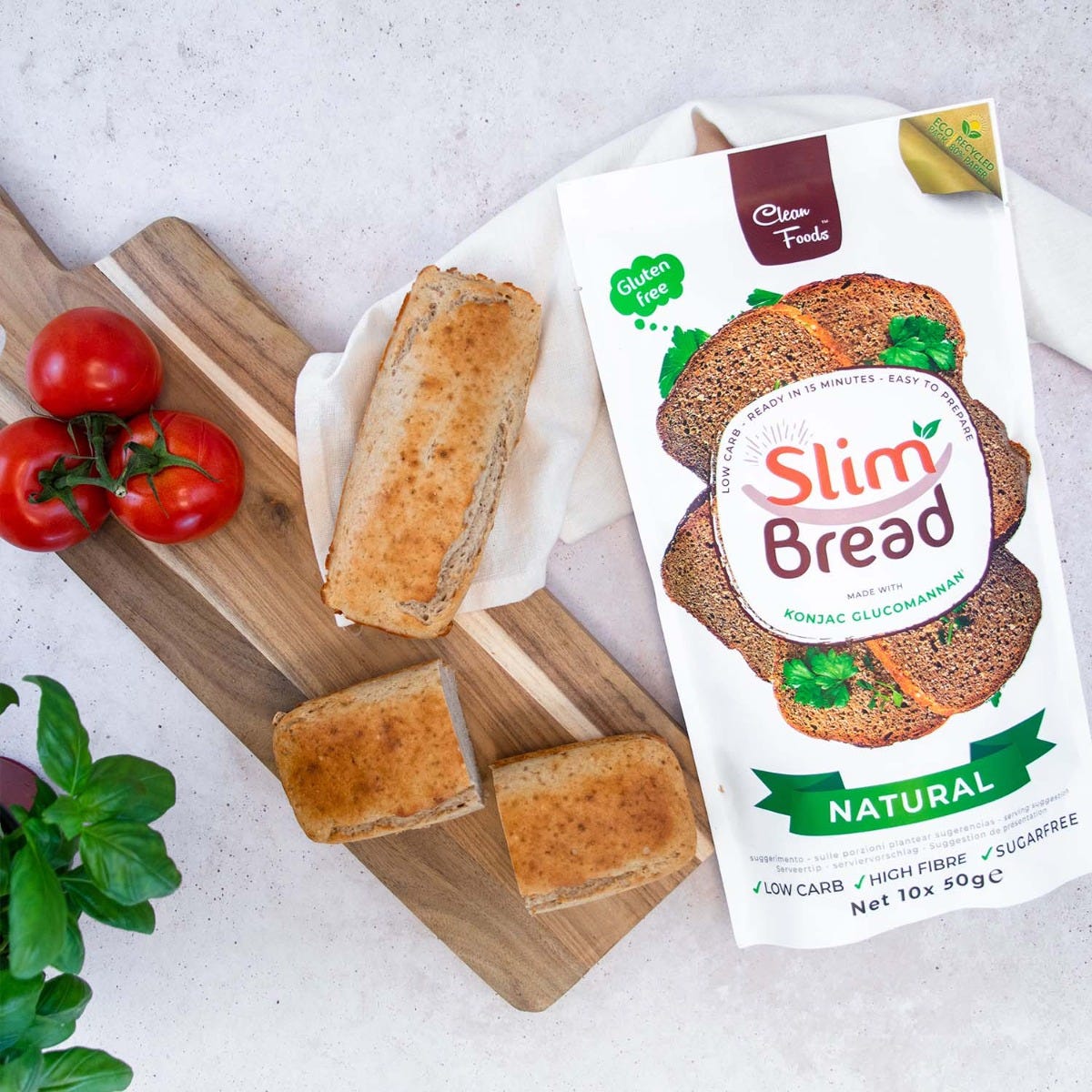SlimBread provides 70% fewer calories than conventional bread. It provides vegetable proteins and fiber. It contains no gluten, no sugar and no wheat flour. We use glucomannan fiber in our bread: a substance that helps you lose weight on a low-calorie diet. It also helps you to lower your cholesterol levels if you consume 4 g per day.